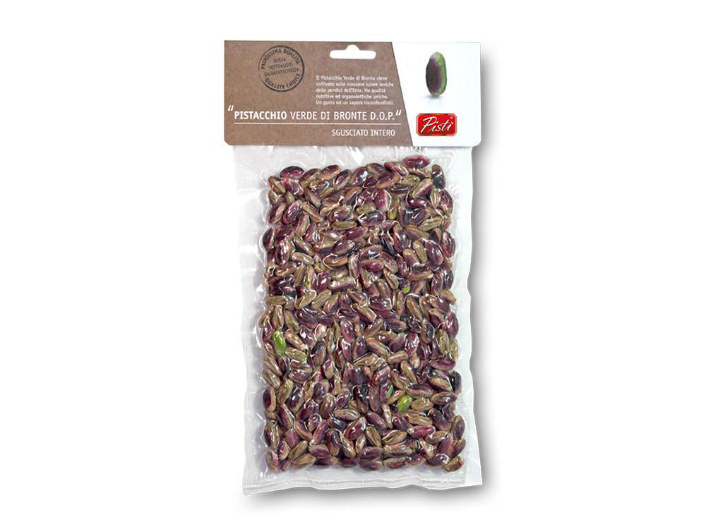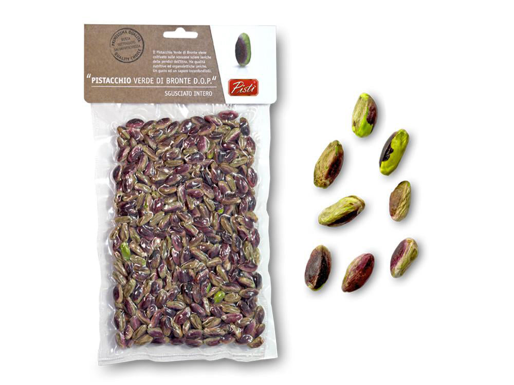 Il nostro “Pistacchio Verde di Bronte DOP” è sgusciato intero e confezionato sottovuoto, per portare a casa tua il profumo dell’Etna.